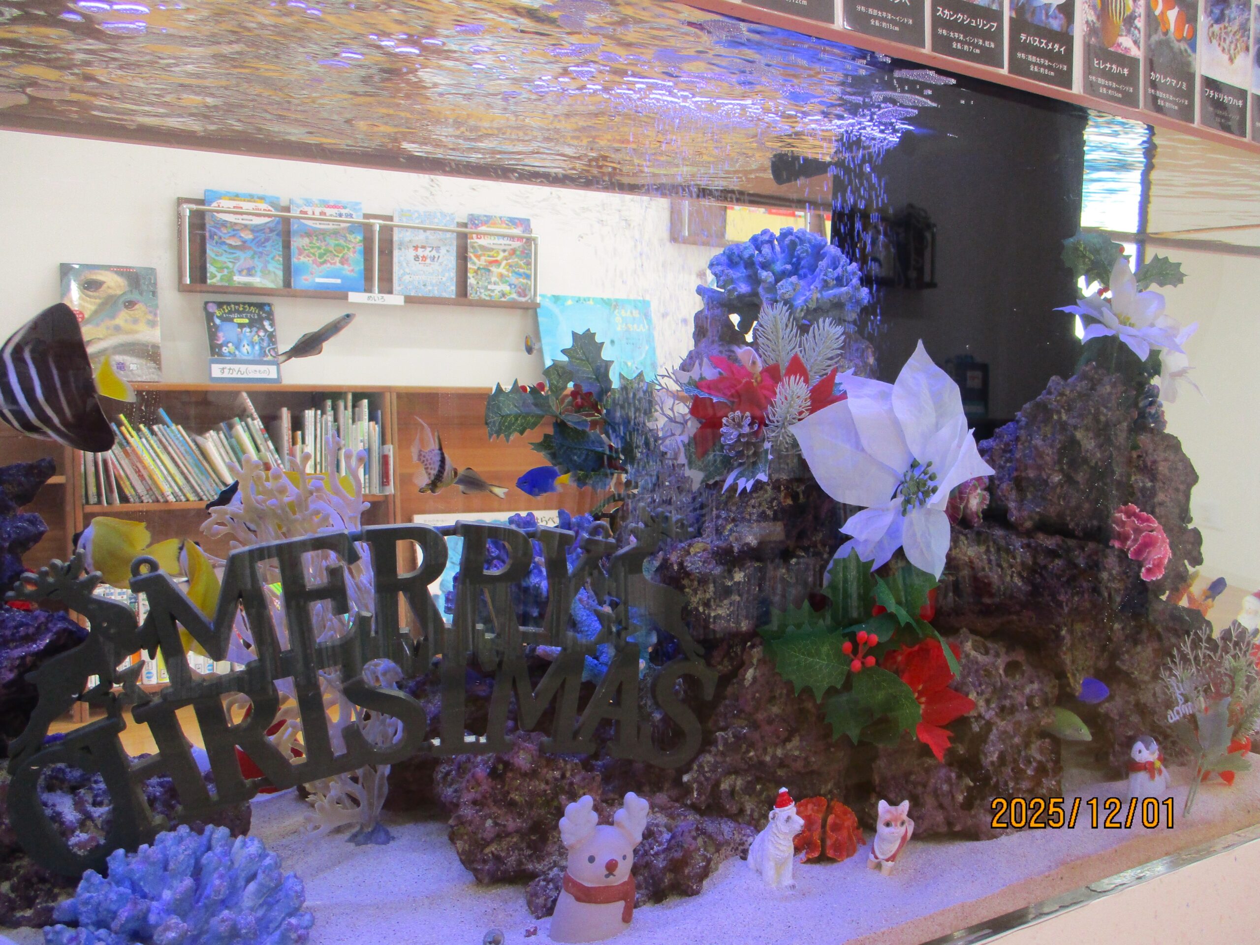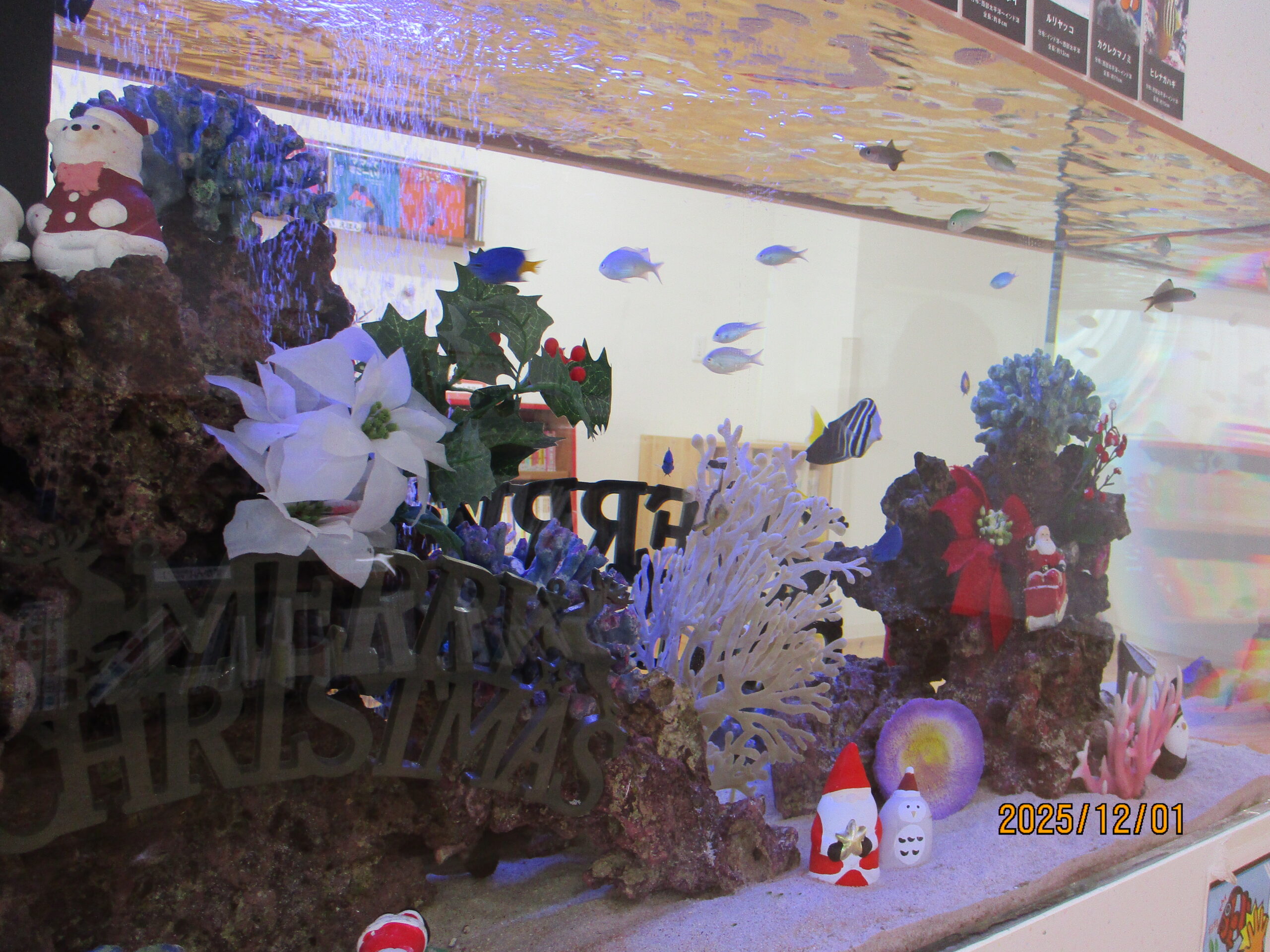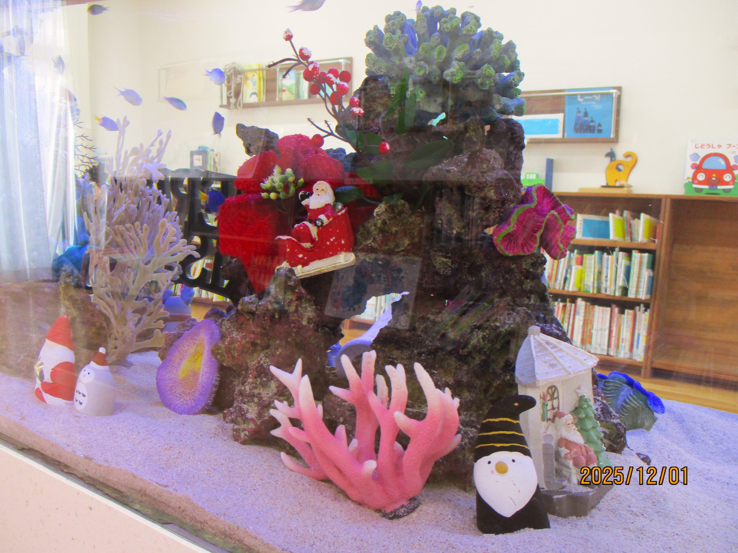 2025年12月03日出来事 お魚さんのお部屋が・・・🐟🎅🎄 園の水槽がクリスマス仕様になりました🐟 サンタさんやトナカイさん、ポインセチアが並び、 水の中にも楽しい冬が広がっているようです。 子どもたちも毎日、嬉しそうに水槽を眺めていますよ。