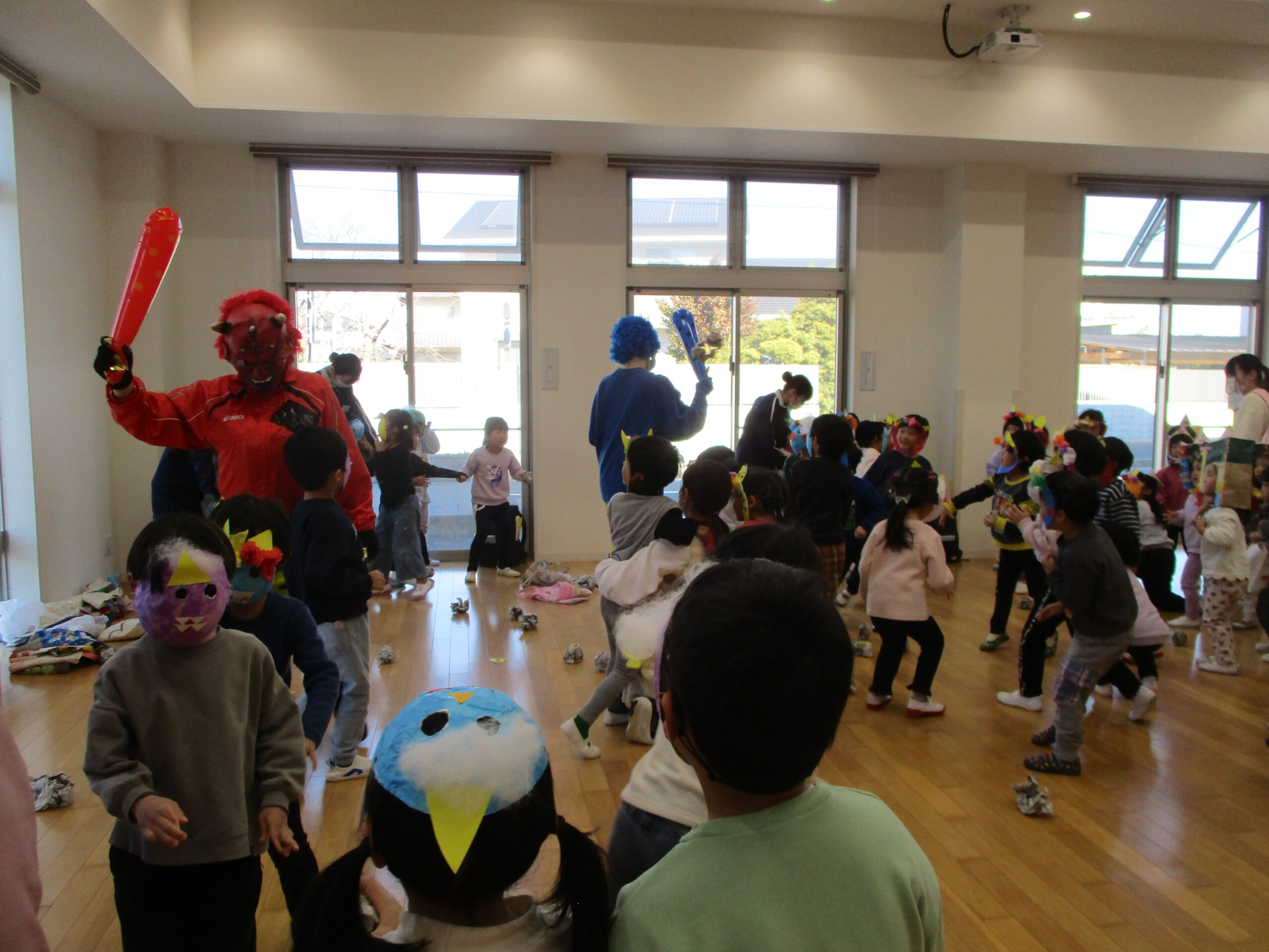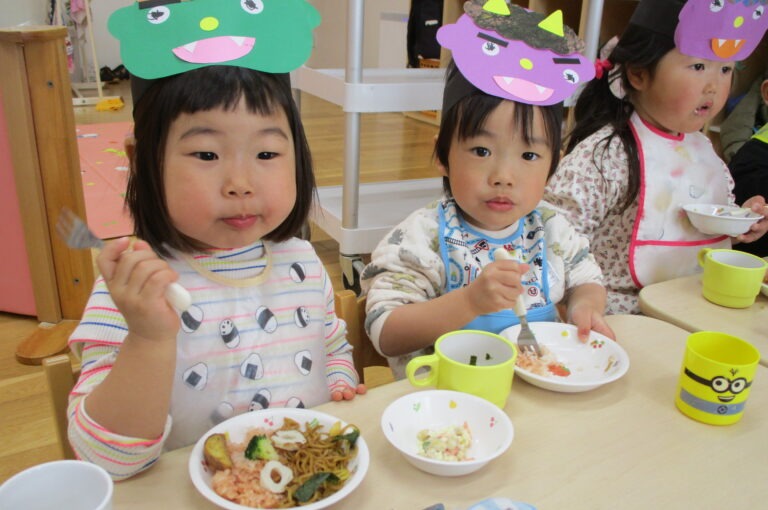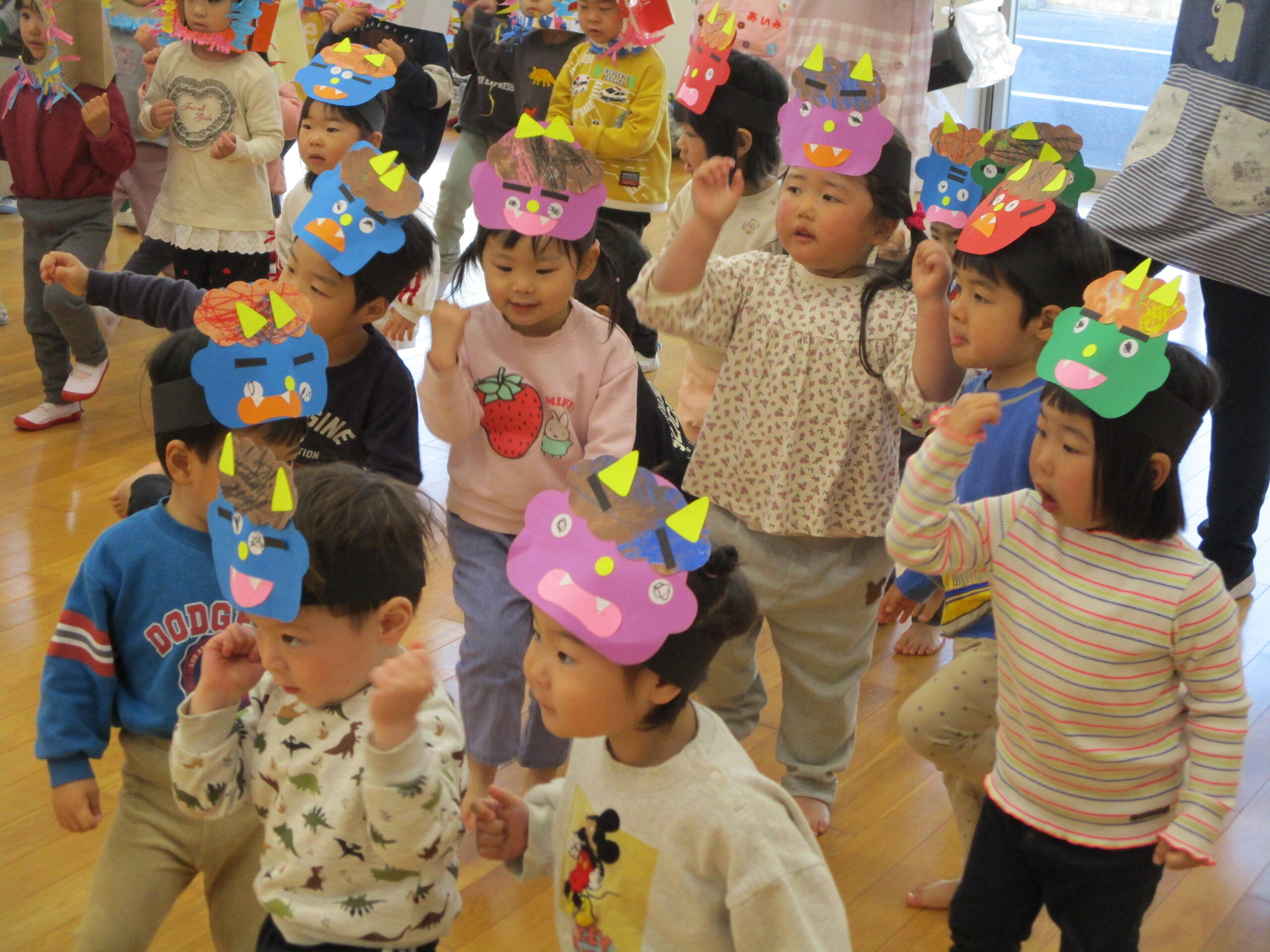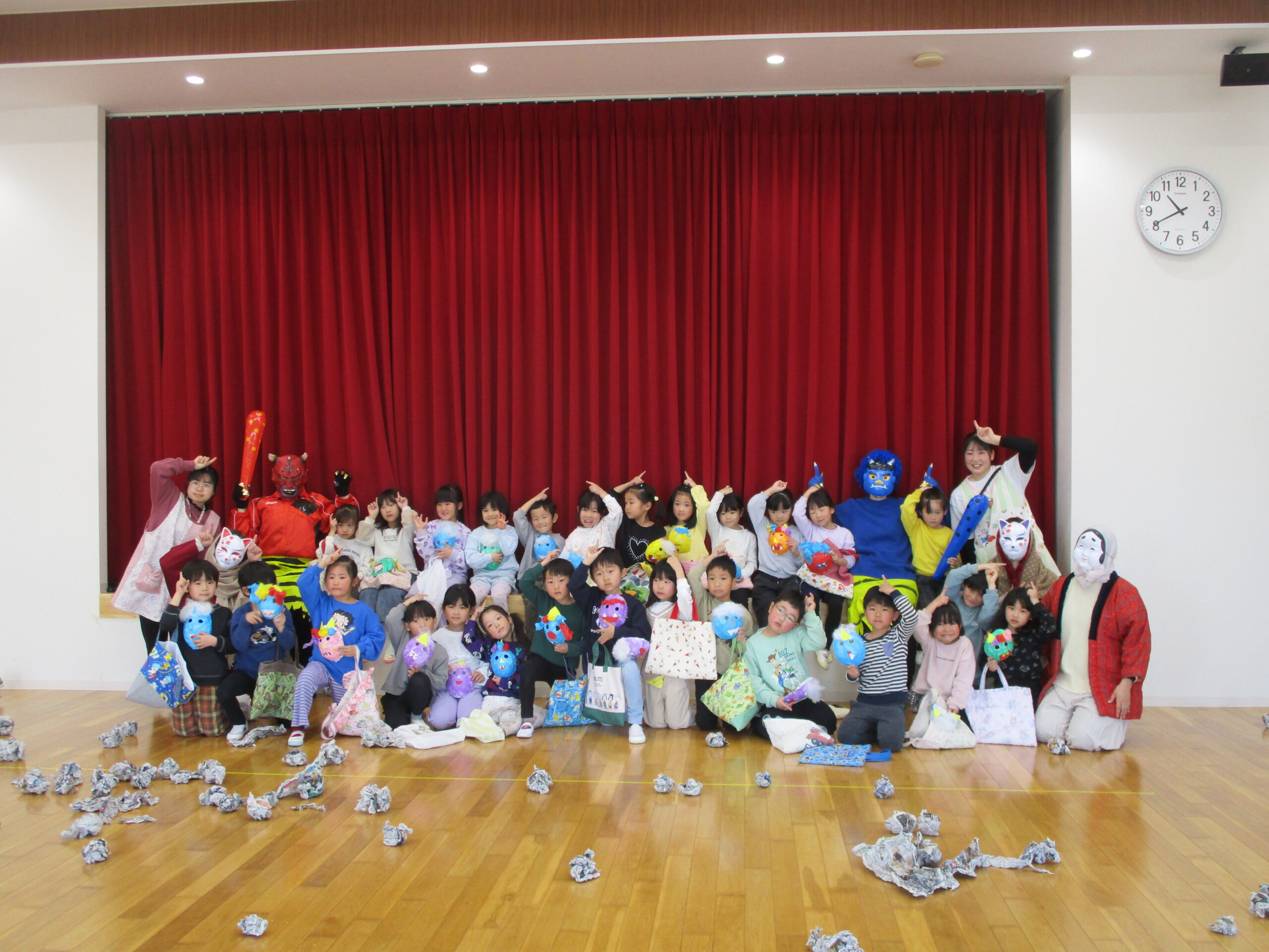 2026年02月20日出来事 節分の豆まきをしました👹 2月3日、こども園で豆まき会を行いました。 鬼が登場すると、少し驚いた様子の子どもたちでしたが、 「鬼は外!福は内!」と元気な声で豆を投げ、一生懸命に 鬼退治をがんばりました!✨ 鬼を退治したあとは、お福さんと狐が登場し、 お菓子まきのプレゼントがありました。 笑顔いっぱいの楽しい時間となりました。