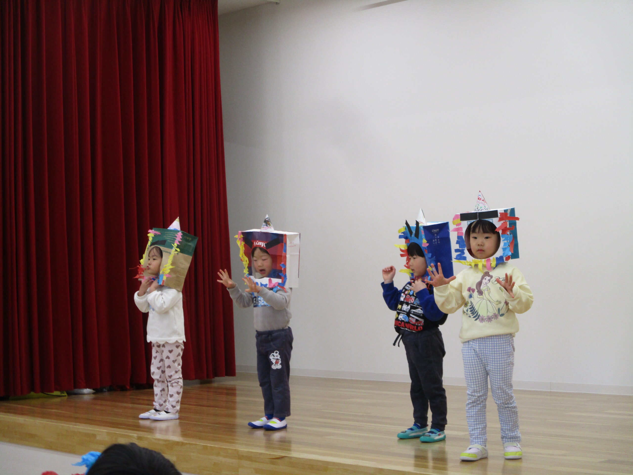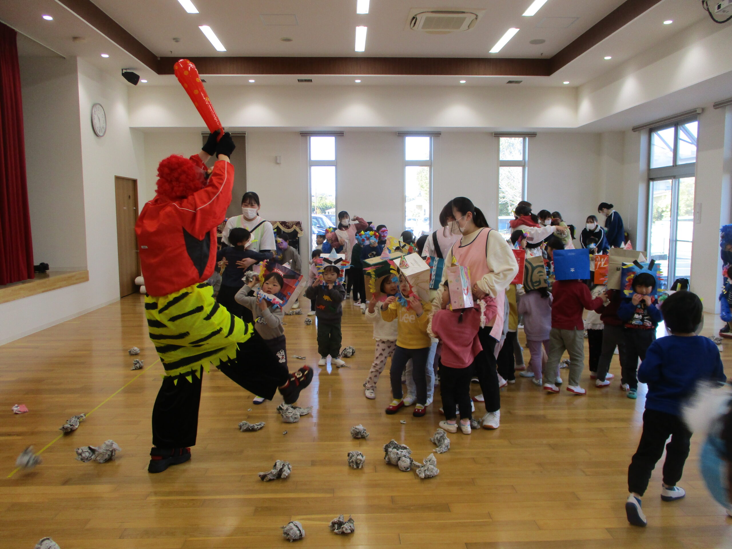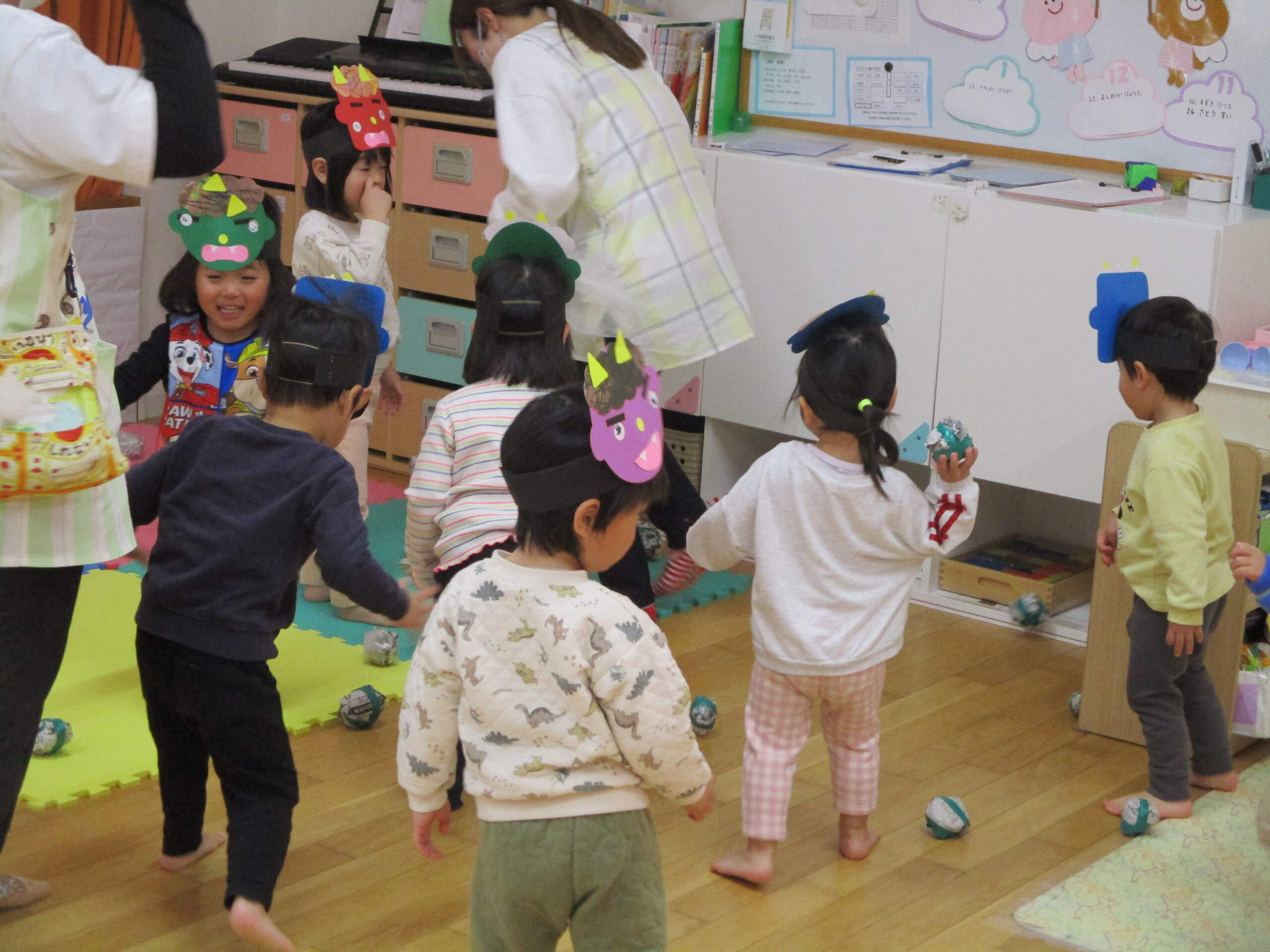 2026年02月20日出来事 節分の豆まきをしました👹 2月3日、こども園で豆まき会を行いました。 鬼が登場すると、少し驚いた様子の子どもたちでしたが、 「鬼は外!福は内!」と元気な声で豆を投げ、一生懸命に 鬼退治をがんばりました!✨ 鬼を退治したあとは、お福さんと狐が登場し、 お菓子まきのプレゼントがありました。 笑顔いっぱいの楽しい時間となりました。